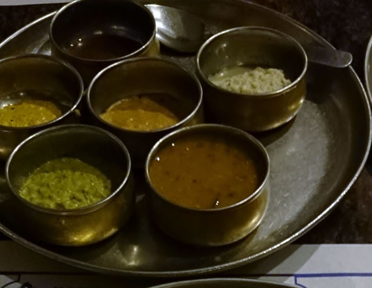 プーリ(左)。スパイスソースは様々な種類がある(右)