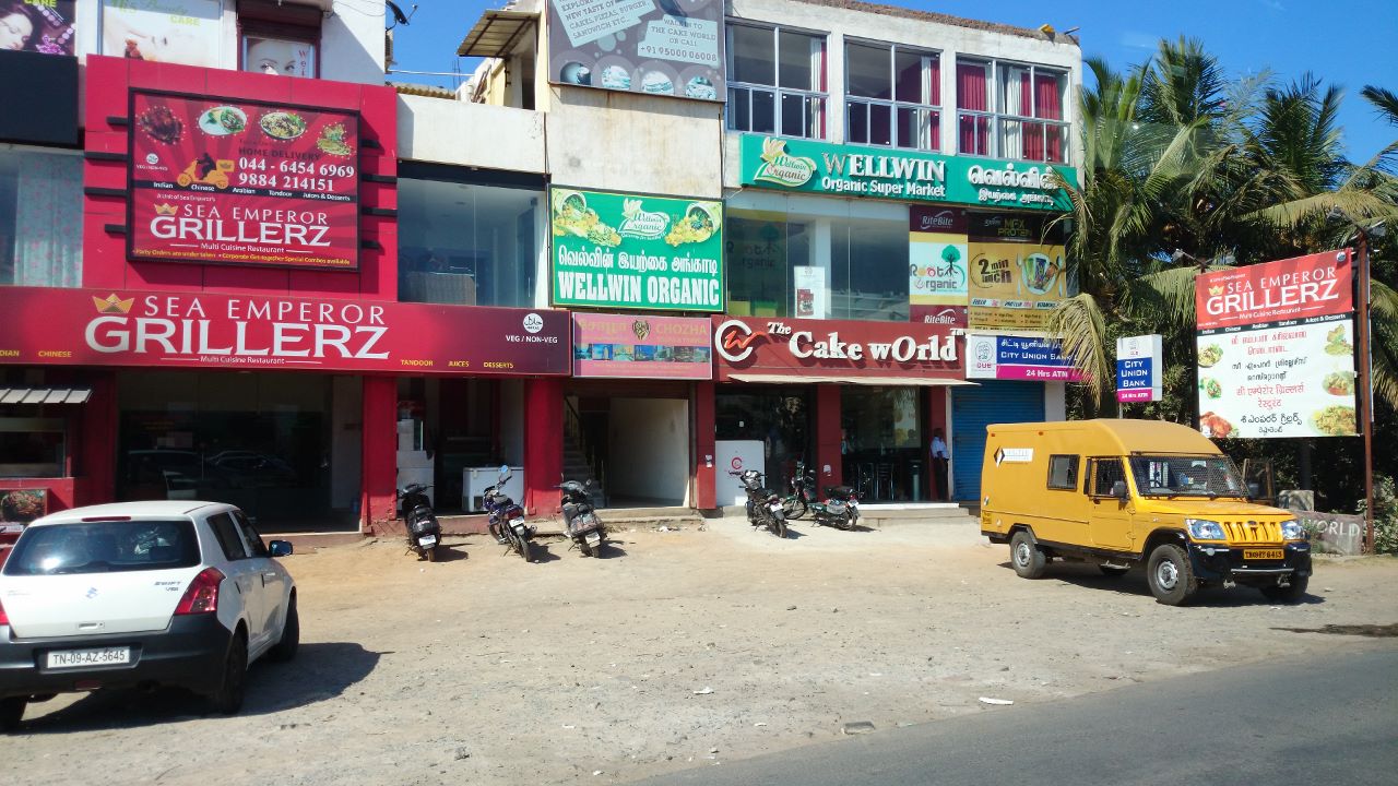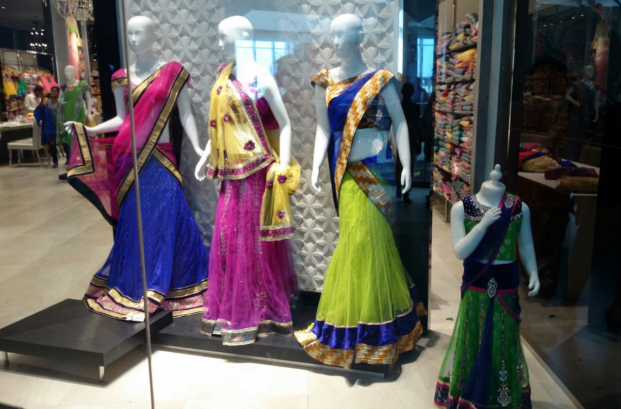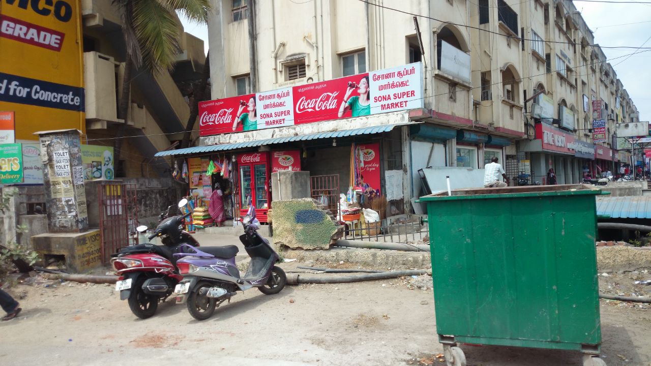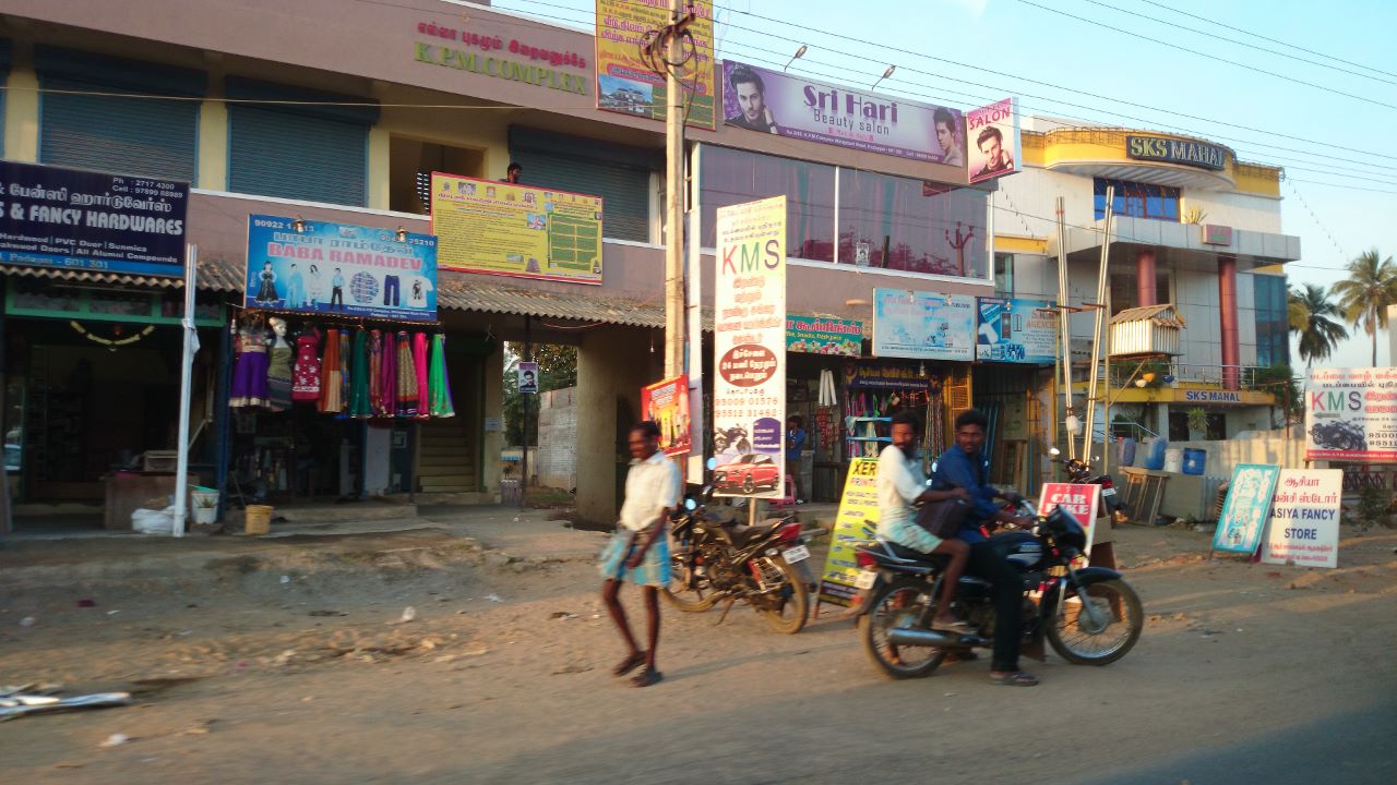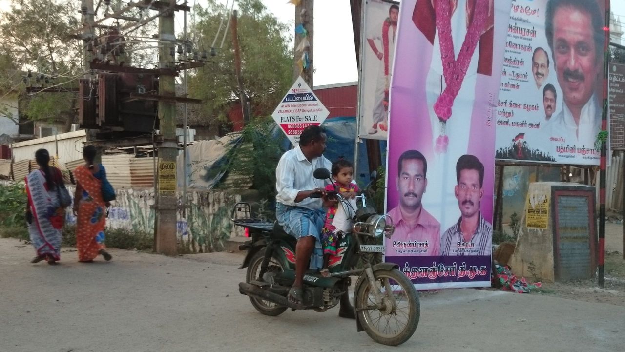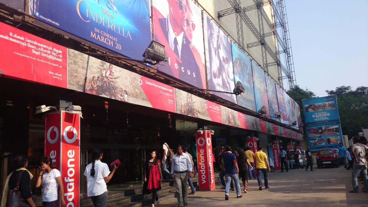週末にチェンナイ市街の映画館に行ってみた。駐車場には巨大なサリー広告の看板。