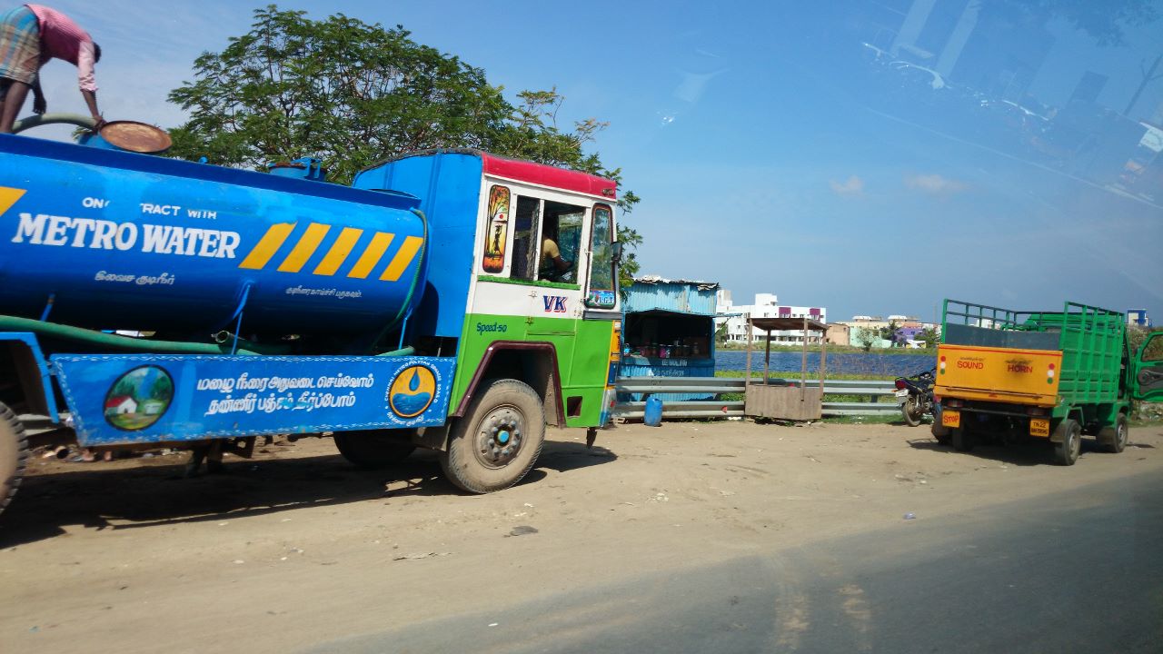 <上下水道が整備されていないので、大量の給水車やバキュームカーが街中を走り回っている>