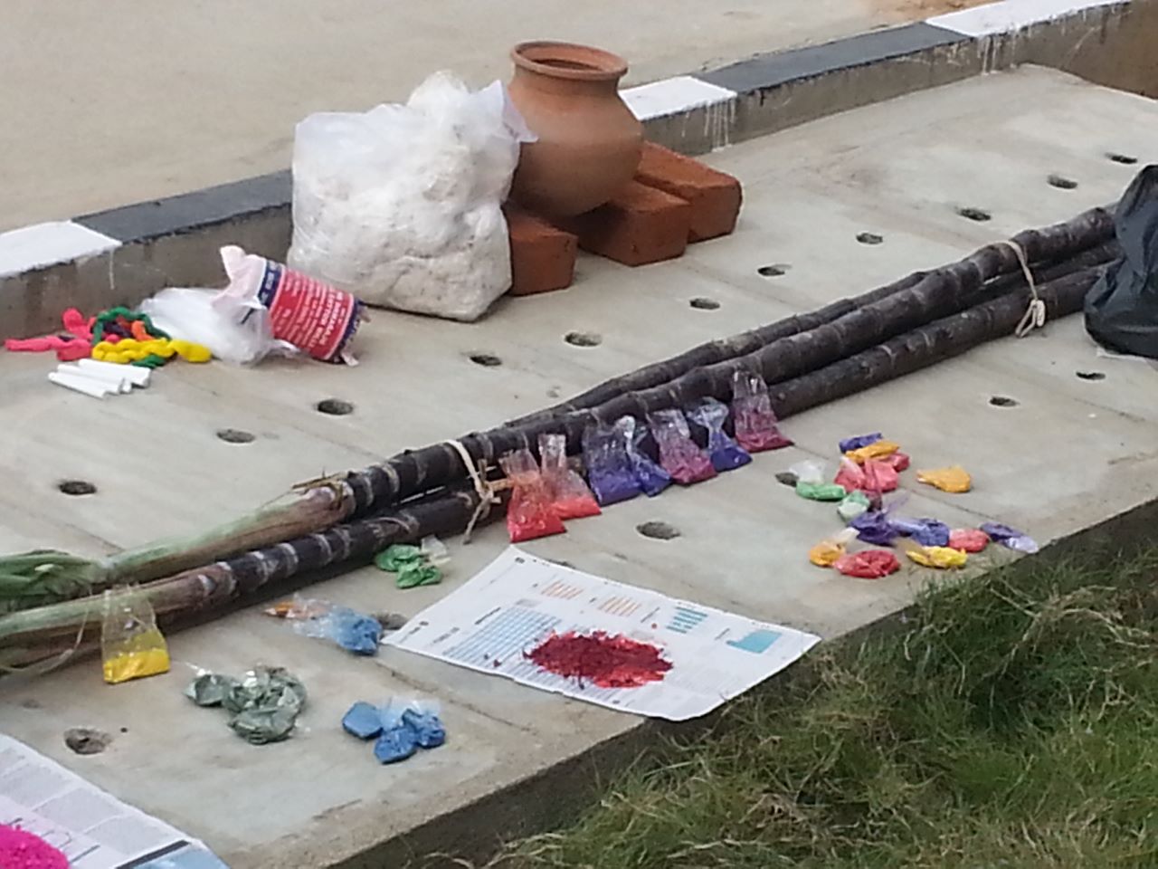 装飾の材料はカラフルなカラー砂(手前)。 中央の木はサトウキビ。 奥にあるのがミルクライス用の窯(これはダミー)