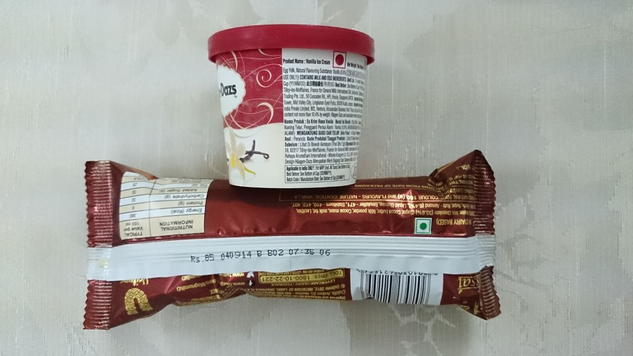 写真(下)は両方ともアイスクリームだが、「ハーゲン・ダッツ」には動物性脂肪が含まれているらしく赤色マークだ。ベジタリアンはハーゲン・ダッツを食べられないようだ。