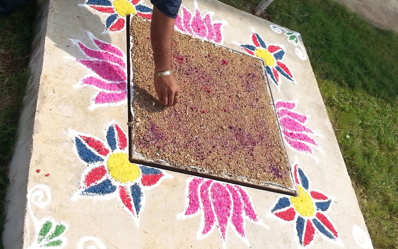 コーラムとは各家庭の玄関前に毎朝描かれる砂絵のことで、様々なシンボルやデザインがある。インド女性による伝統芸術であり、女性達は子供の頃から母親や姉妹と共に、玄関先にコーラムを描くことを習慣にしている。これは花嫁修業のひとつでもあるらしい。